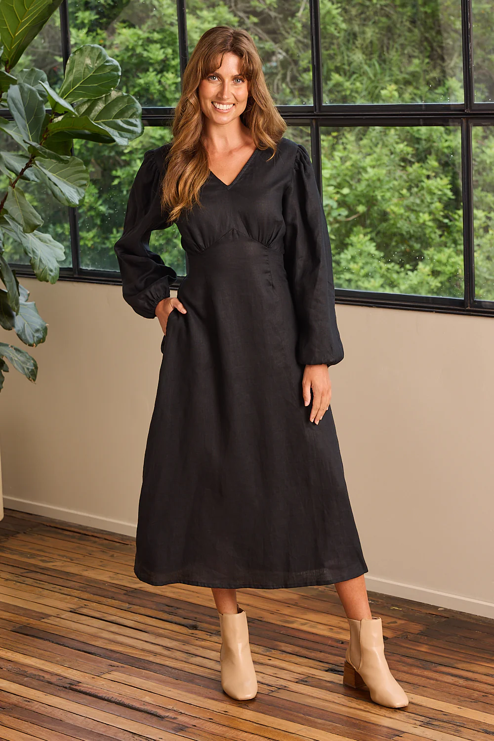 Farrah Long Sleeve Linen Dress in Black